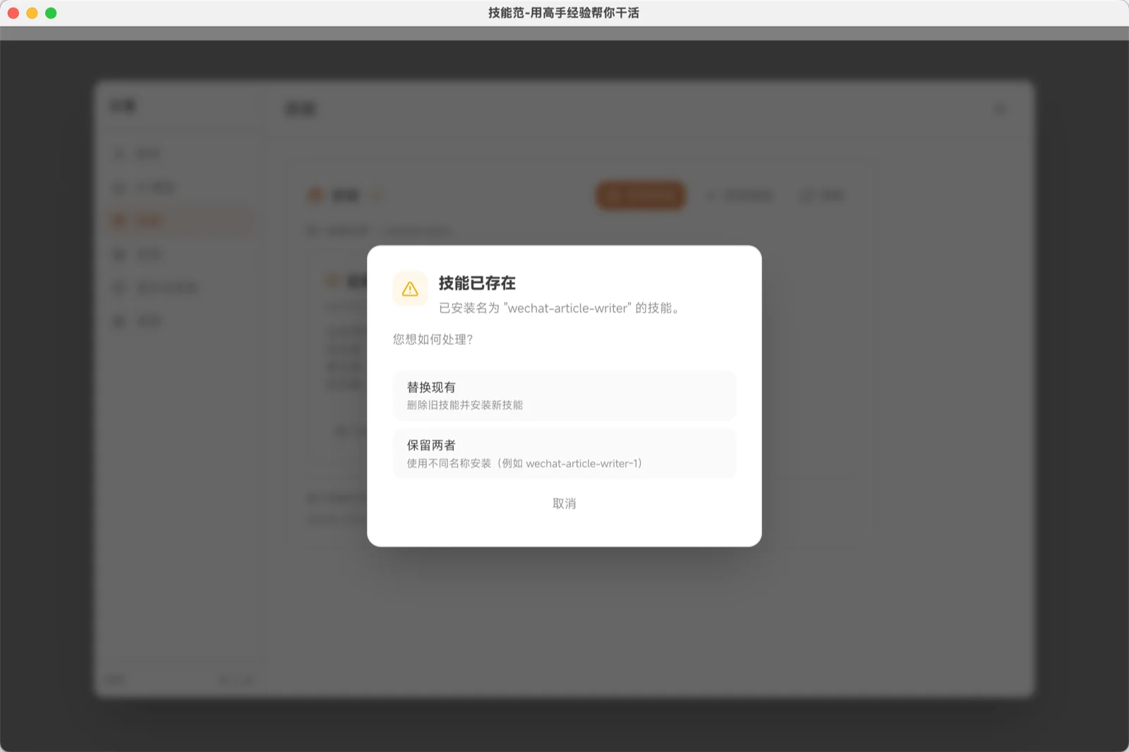 下载的技能会自动安装,重启应用后即可使用。